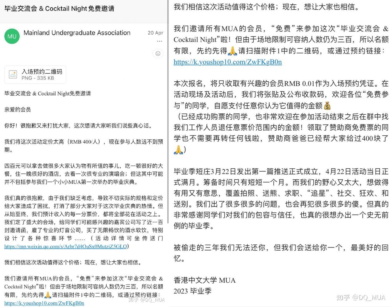 2023 年 4 月,MUA 计划举办“毕业酒会”,结果非常失败,以 MUA“自掏腰包”,“请客”才勉强达到参与人数。MUA 毕业酒会反映出两个“钱”的问题: