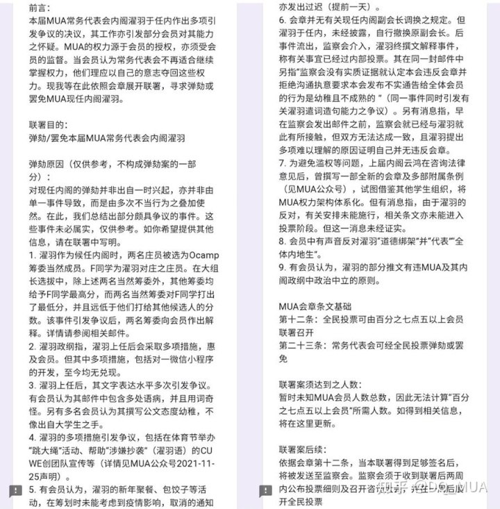 MUA还有多次操纵选举及滥用解释权的案底。因此DQMUA在此呼吁拒绝承认新内阁作为内地生的代表,要求重新选举,并以解散MUA为目标。