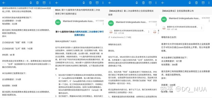 这是四封邮件的截图。图一是第一次投票的结果,很明显有效票数不达标,会章修改是无效的。但不久后,MUA内阁便发出第二次投票的提议:与其说是提议,不如说是通知,重复说明几条修改会章的好处,并在短短的内部运作后,MUA便推翻了神圣的选举结果,开展了第二次投票。可以预见,如果第二次投票也未通过,MUA便会不断地拉布,否认结果并重新投票,只为给修改会章披上民主的外衣。正常的选举程序是不会允许同一个议题在短时间中反复投票的。 MUA操纵选举让内地生不胜其烦,他们的企图也最终实现。