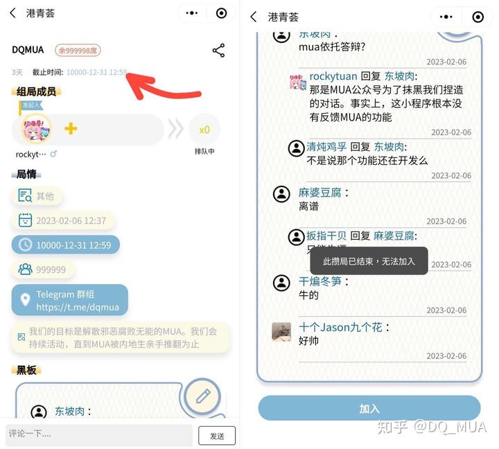 除了大张旗鼓地删帖外,伪树洞对MUA也会在暗中使绊子。伪树洞有个“攒局”的功能,我曾将DQMUA的信息发布在上面,以期吸引志同道合者。很快就收到了踊跃的评论。但蹊跷的是,始终没有一个人点击“加入”按键。一段时间后我使用另一个伪树洞号浏览该贴时,意外发现截止时间尚早,且名额充足的情况下,点击“加入”竟会显示“攒局结束无法加入”。我本以为是bug,于是去测试了其他攒局贴,发现都能正常运行。毫无疑问这是伪树洞对该贴进行限制,其手段之龌龊令人不耻。对此,伪树洞管理员非但没有认错道歉,反而倒打一耙,宣称我设置的日期太大。万万没想到时至今日还有程序会遭到千年虫的困扰。