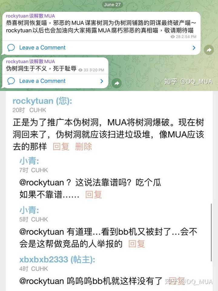 有眼可见的,有耳可听的,都心知肚明,树洞的消失,最大受益者是谁?是内地生吗?断乎不是。是DQMUA吗?我的早期发言都在树洞,再度消失也令我们损失惨重。毫无疑问,最大受益者,就是伪树洞以及他们身后的MUA。就是他们,在唯一短暂的一天与树洞平等竞争,却一败涂地而恼羞成怒,用这种下作的手段将其摧毁。